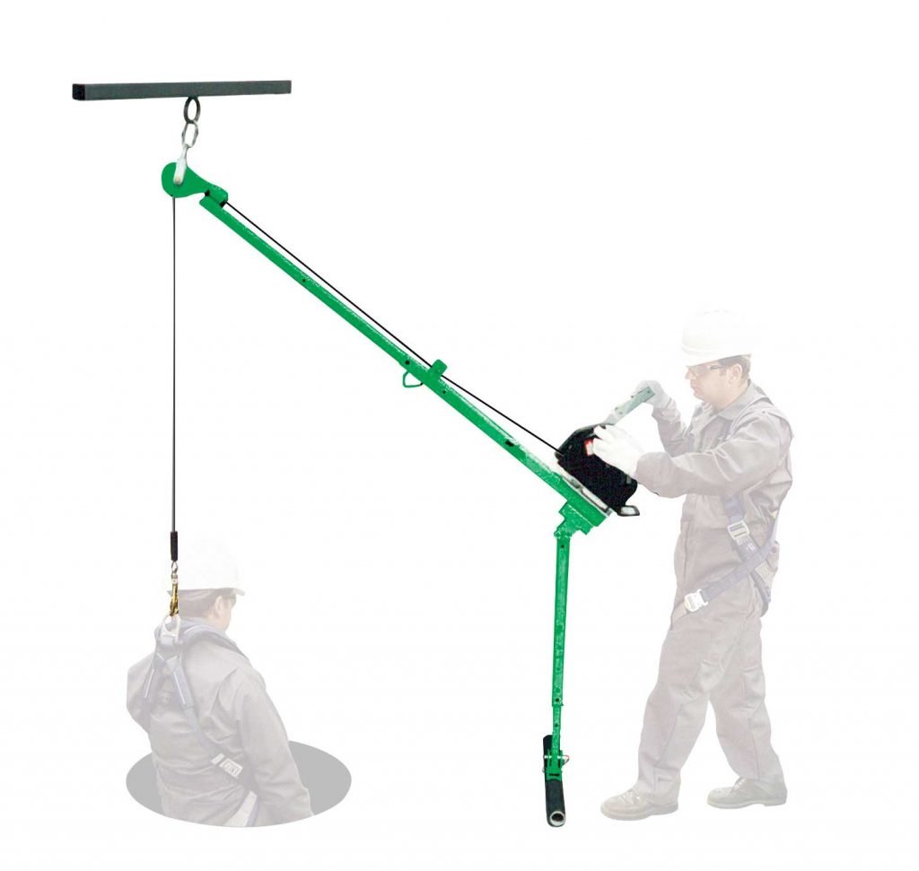 Il sollevamento a piantana estensibile collega tramite moschettone la staffa universale del dispositivo a un punto di ancoraggio adatto, permettendo di lavorare in qualsiasi direzione e angolazione.